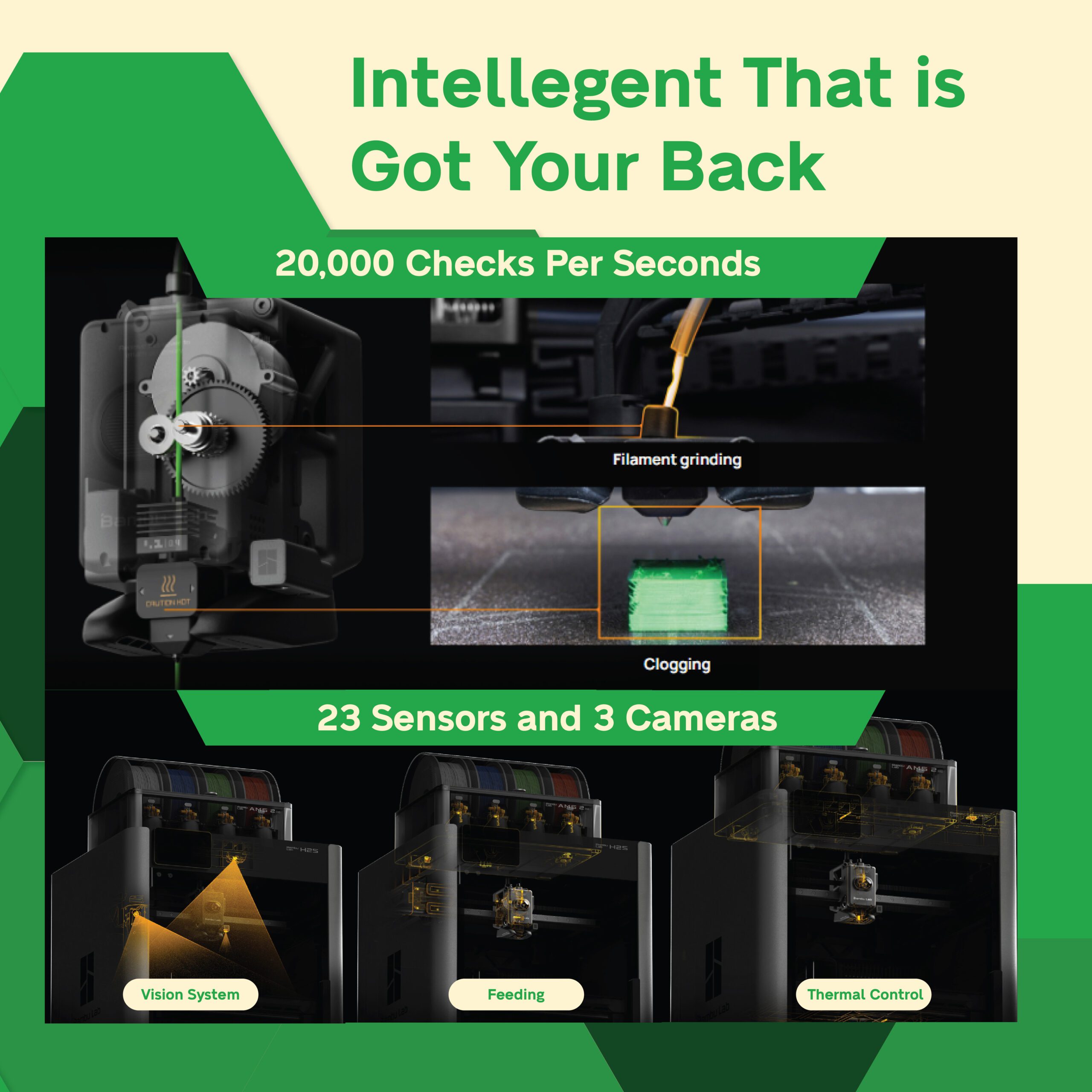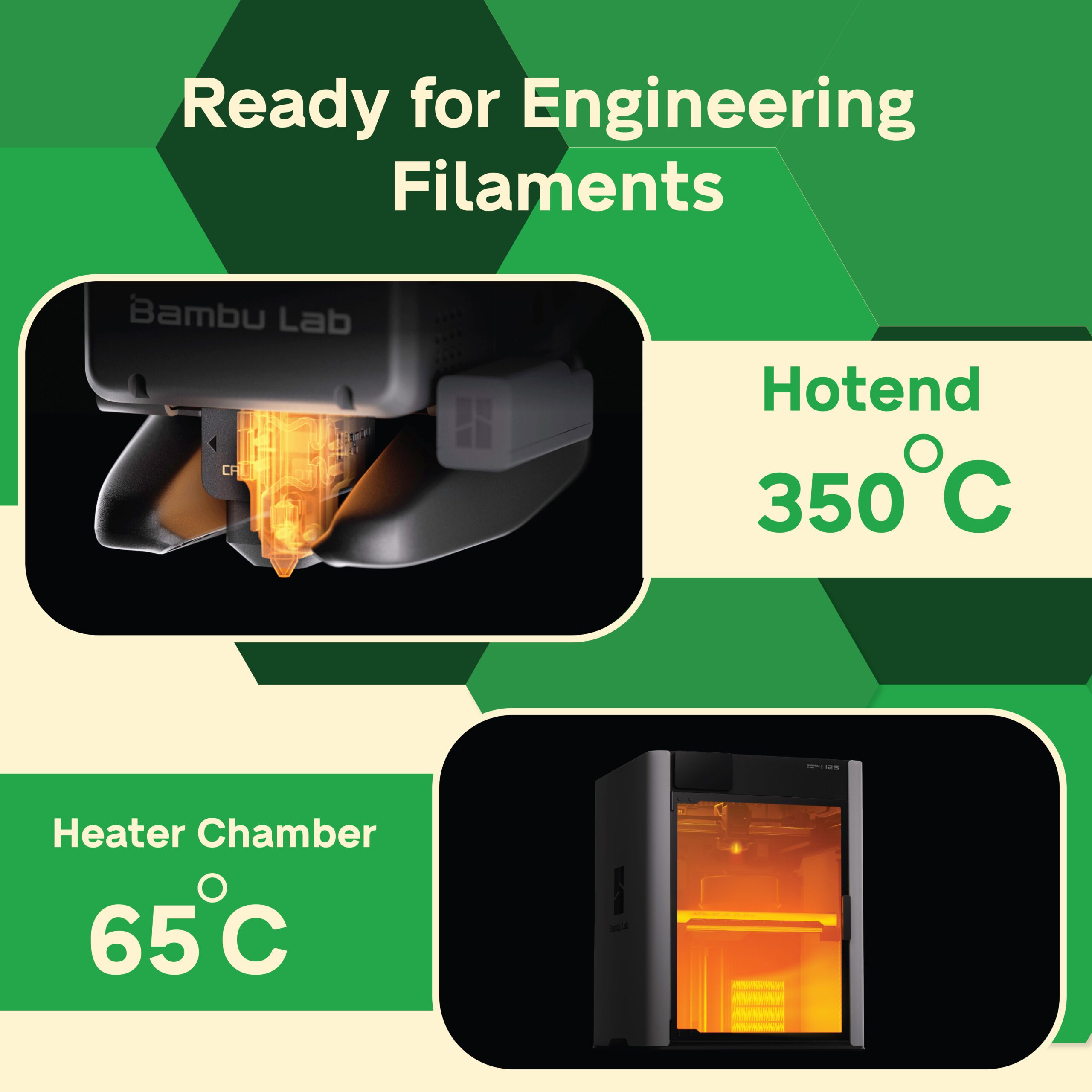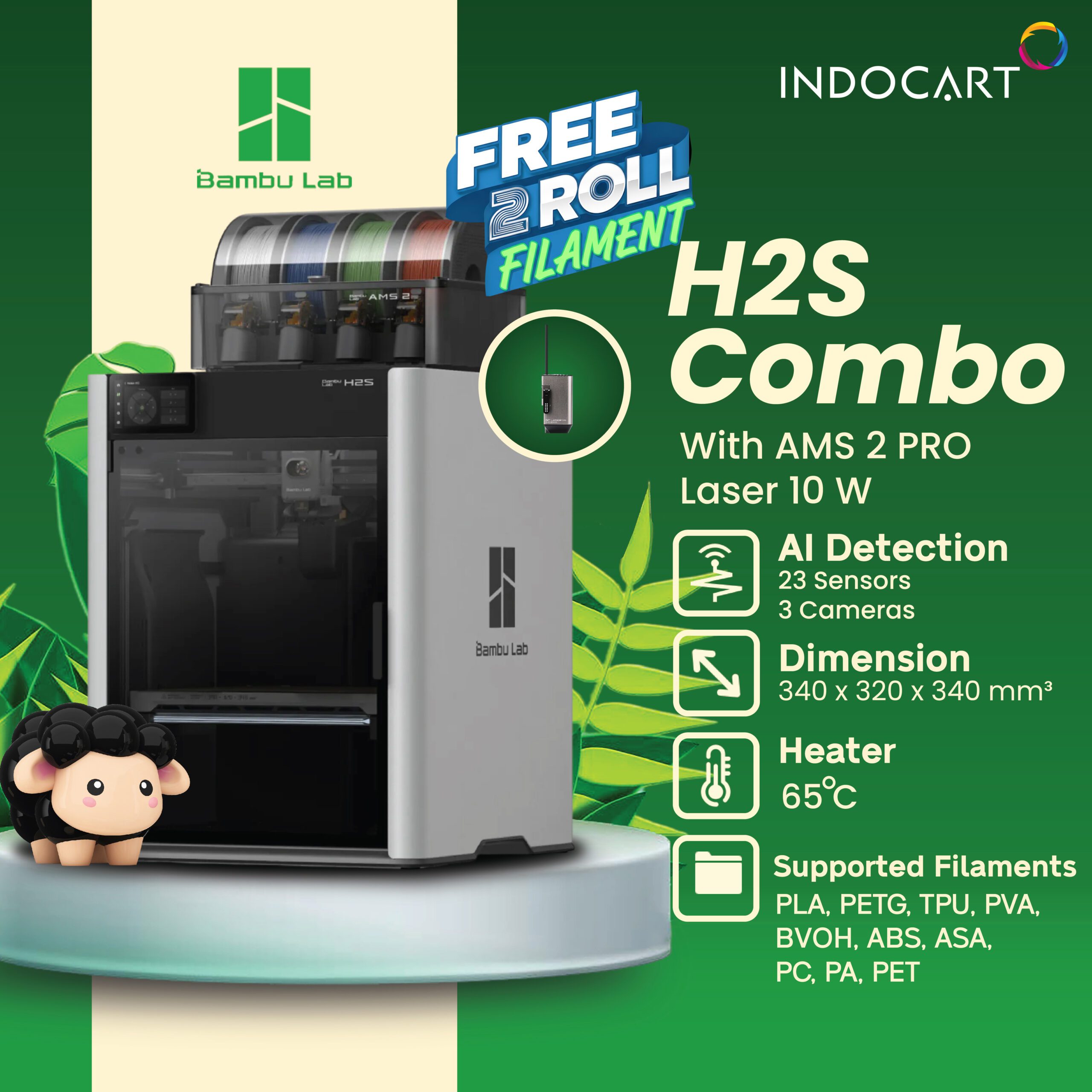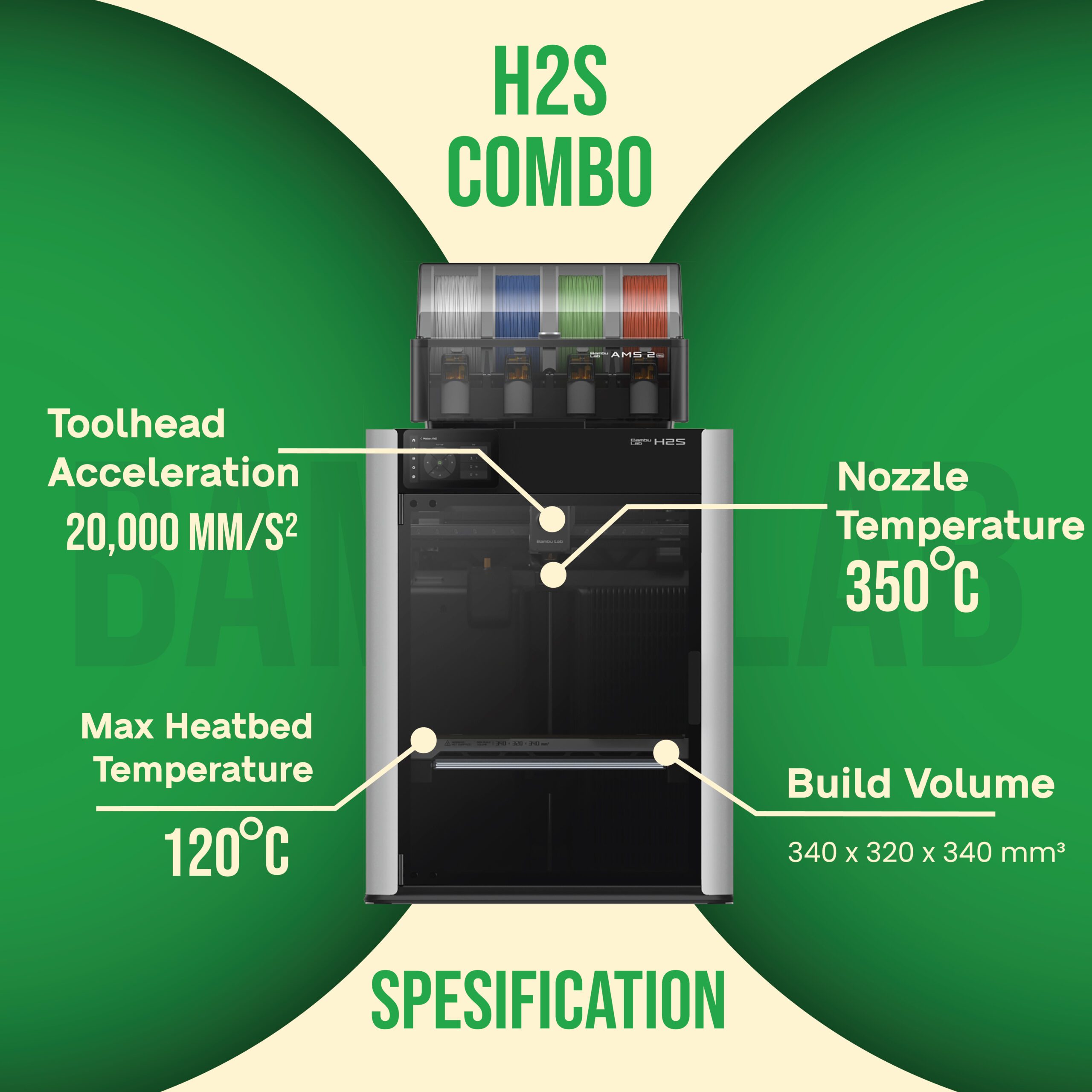 Bambu Lab H2S adalah pusat produksi personal yang menggabungkan 3D printing multi-material & multi-color, laser cutting/engraving 10W, dan digital cutting dalam satu mesin. Dengan build volume besar 340×320×340 mm, hotend 350℃, serta chamber berpemanas 65℃, printer ini siap mencetak material teknik (PLA hingga PPA/PPS reinforced) dengan kecepatan hingga 1000 mm/s. Didukung AI vision system, 23 sensor & 3 kamera, serta filtrasi udara pintar, H2S menawarkan hasil presisi <50 μm sekaligus keamanan maksimal.