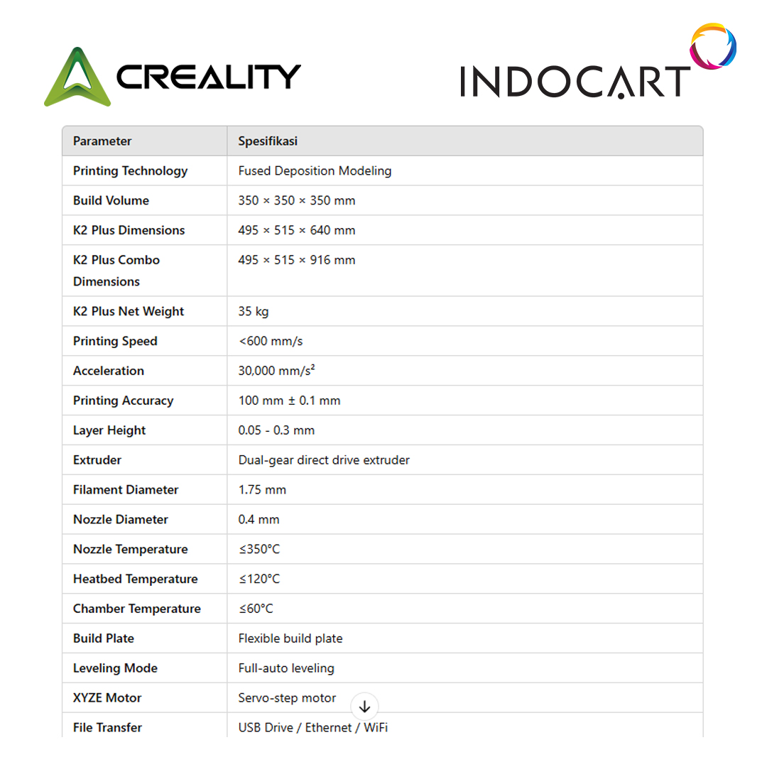 Printing Speed: <600mm/s Acceleration: 30000mm/s² Printing Accuracy: 100mm±0.1mm Layer Height: 0.05-0.3mm Extruder: Dual-gear direct drive extruder Nozzle Temperature: ≤350°C Heatbed Temperature: ≤120°C Chamber Temperature: ≤60°C Garansi sparepart ( cacat pabrik ) selama 1 tahun untuk Pembelian 3D yang dijual di IndoCart Kunjungi INDOCART MAKERSPACE dan BUKTIKAN sendiri Tersedia UNIT DEMO, FREE PELATIHAN, KONSULTASI serta dapatkan PENAWARAN MENARIK lainnya Kami siap melayani anda karena kami paham produk yang kami jual.