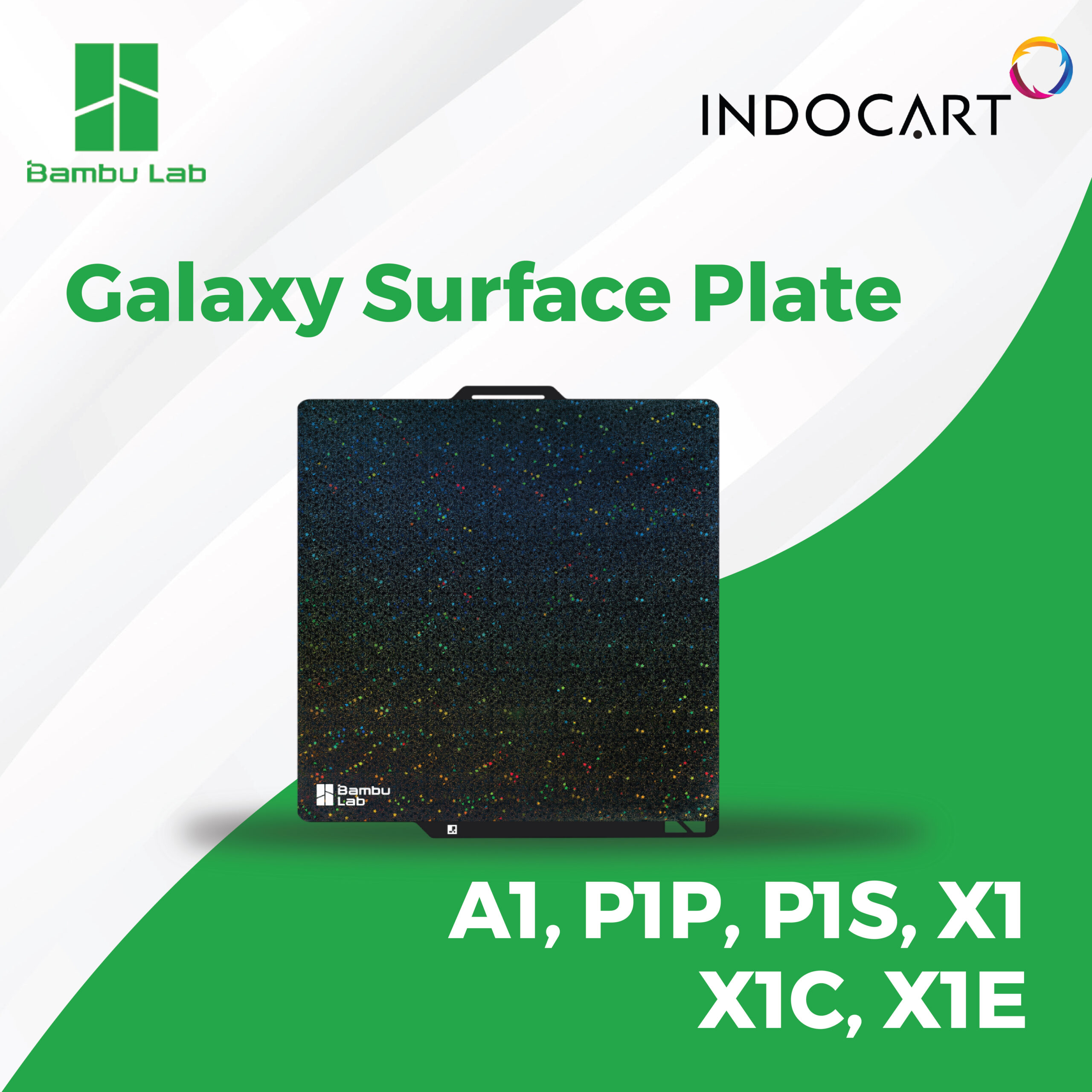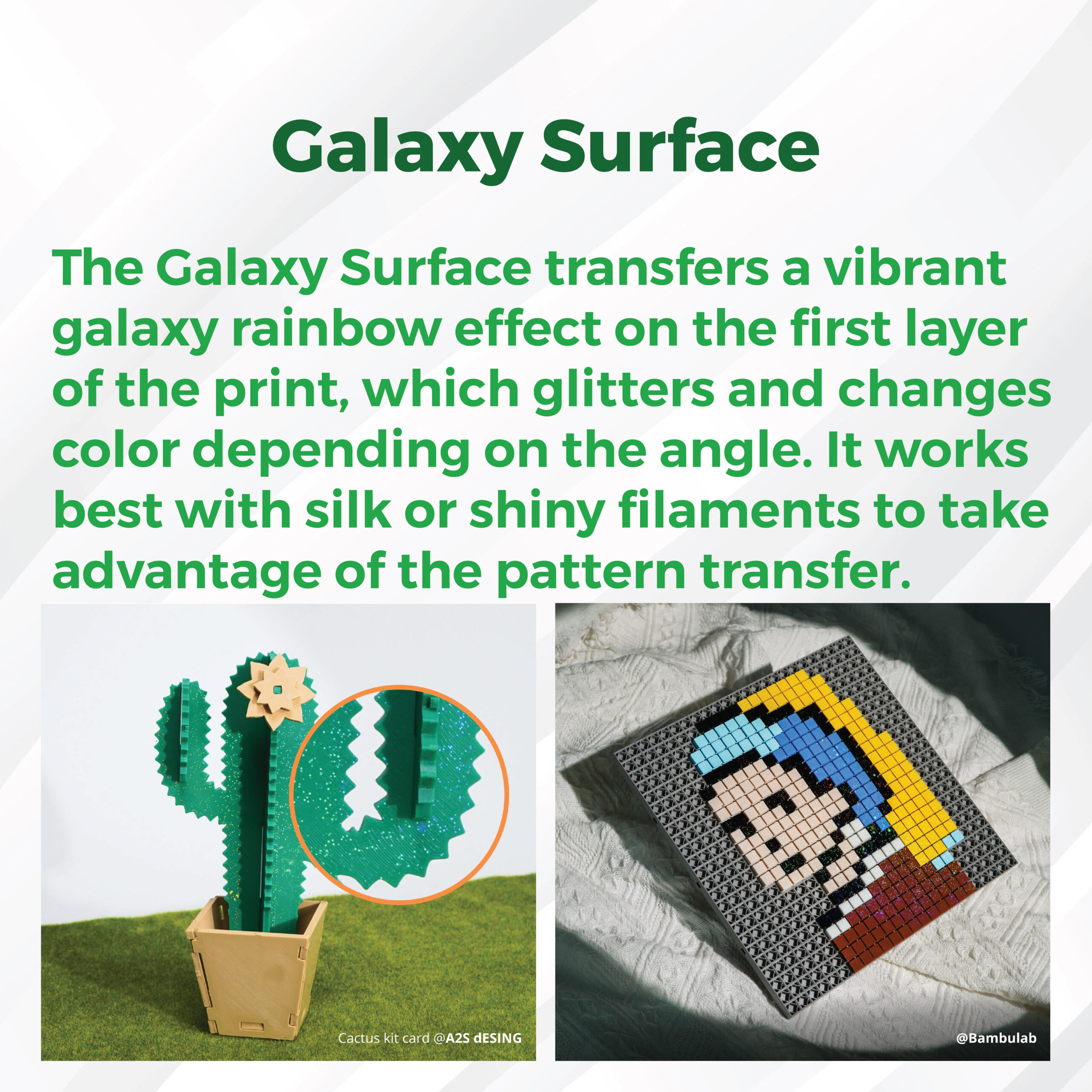 Bambu Galaxy Surface Sheet mentransfer efek pelangi galaksi yang hidup pada lapisan pertama cetakan, yang berkilau dan berubah warna tergantung pada sudut pandang.