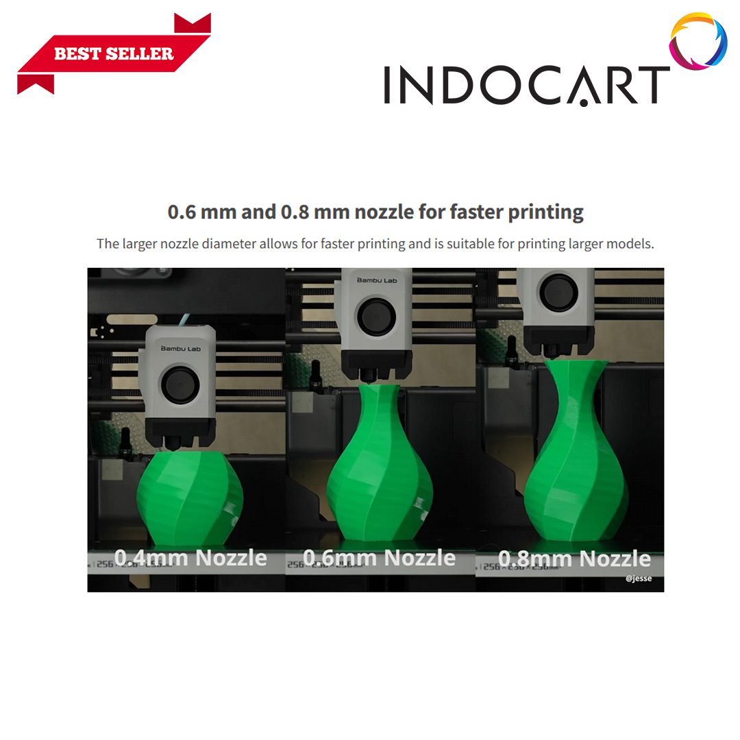 Ukuran lebih besar (0.6mm, 0.8mm) memberikan kecepatan cetak lebih tinggi