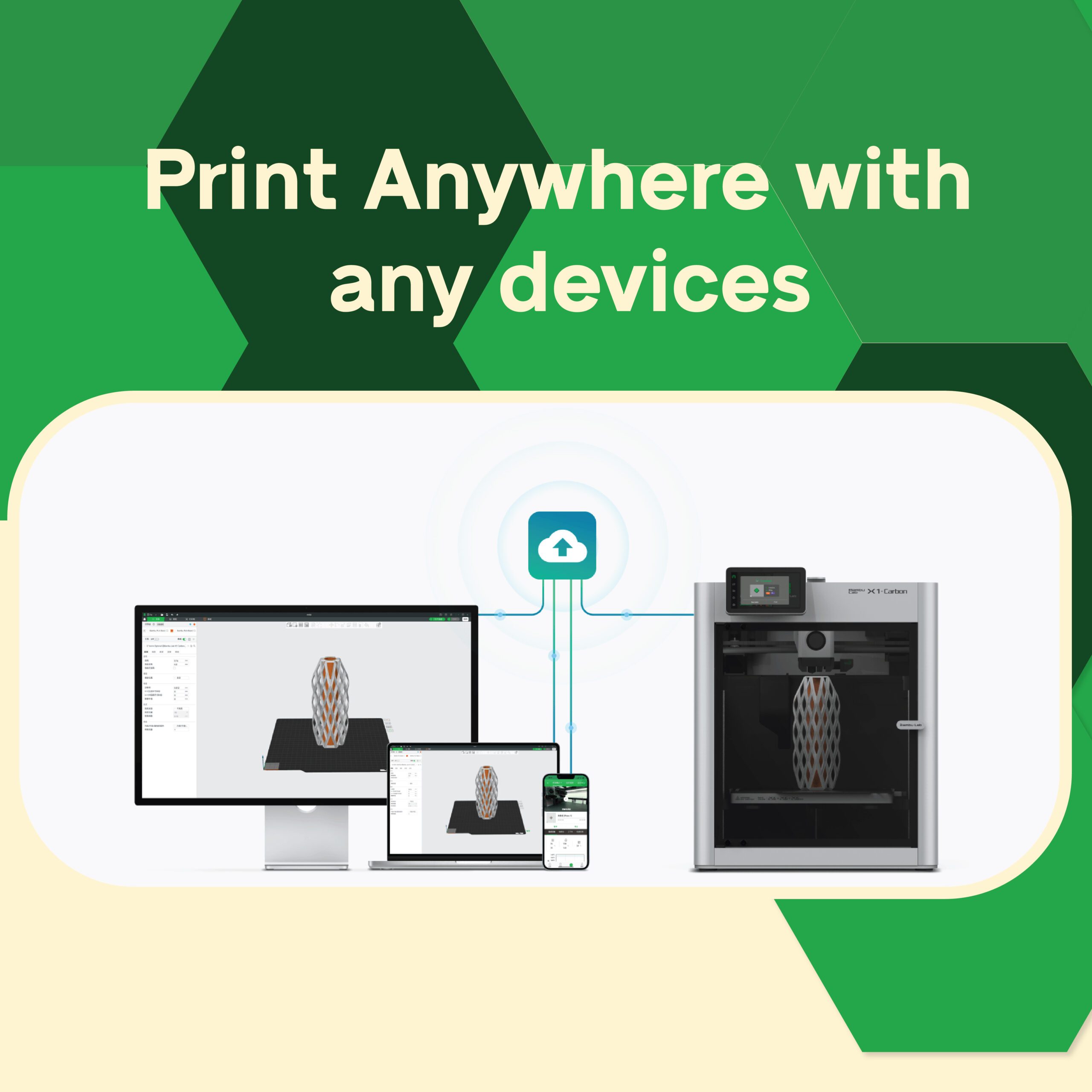Kompatibel dengan berbagai material seperti PLA, PETG, TPU, ABS, ASA, PC, PA, dan serat karbon, menjadikan X1 pilihan ideal untuk kebutuhan profesional dan teknik.