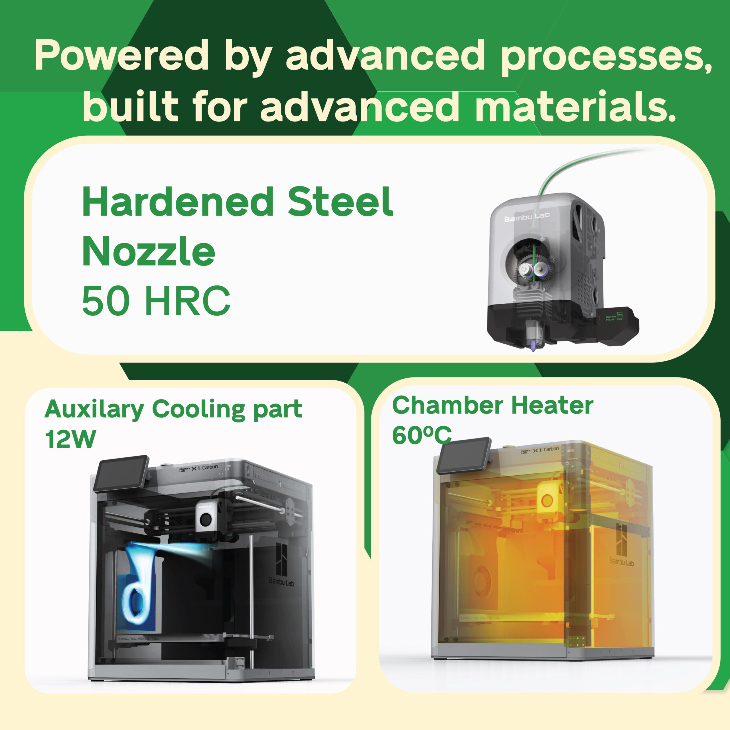 Kompatibel dengan berbagai material seperti PLA, PETG, TPU, ABS, ASA, PC, PA, dan serat karbon, menjadikan X1 pilihan ideal untuk kebutuhan profesional dan teknik.