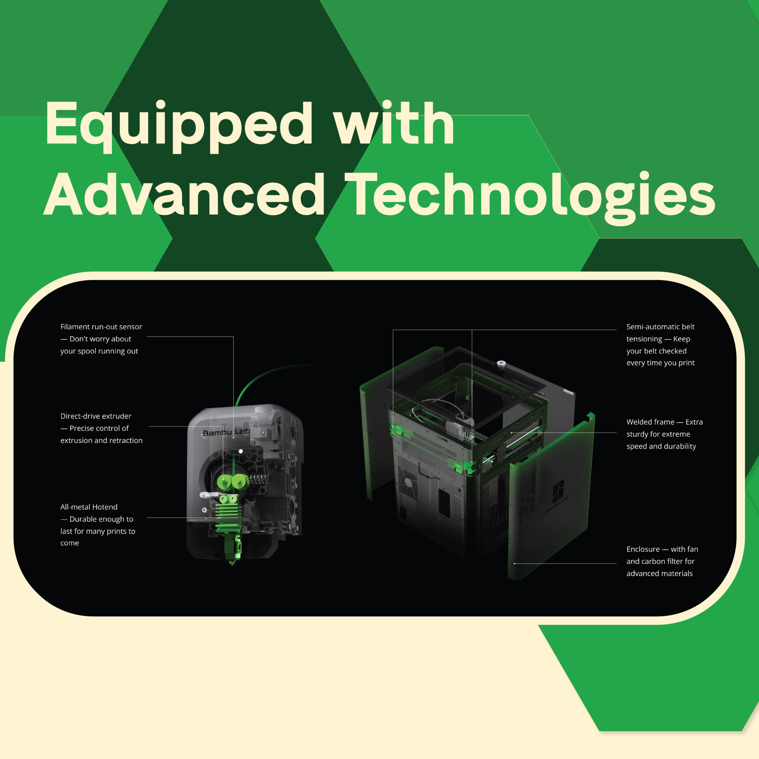 Dilengkapi fitur unggulan seperti sensor filamen, extruder direct-drive, hotend full-metal, frame las kokoh, enclosure bawaan, dan semi-auto belt tensioning.