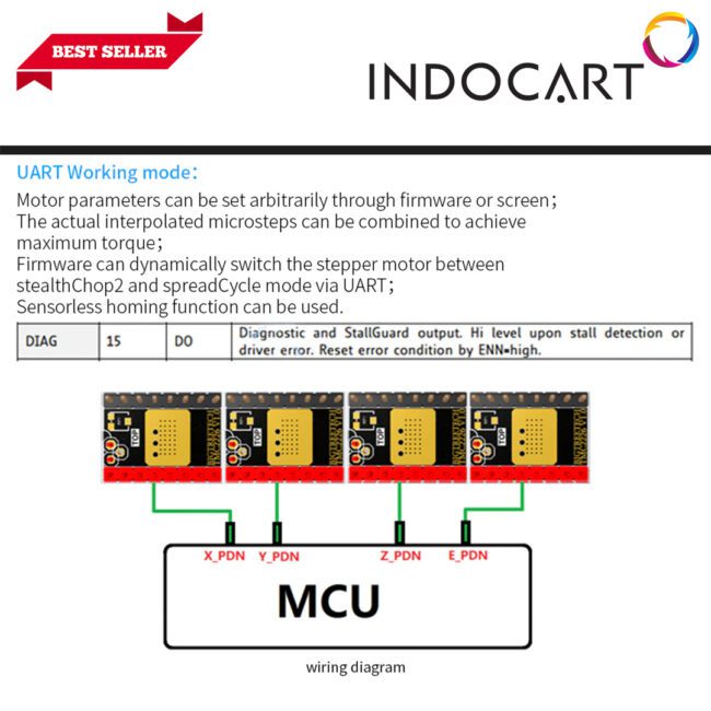 The TMC2226 is an ultra-silent motor driver IC for two phase stepper motors. TRINAMICs sophisticated StealthChop2 chopper ensures noiseless operation, maximum efficiency and best motor torque. Its fast current regulation and optional combination with SpreadCycle allow highly dynamic motion while adding. StallGuard for sensorless homing. The integrated power MOSFETs handle motor currents up to 2A RMS with protection and diagnostic features for robust and reliable operation. A simple to use UART interface opens up tuning and control options. Store application tuning to OTP memory. Industries’ most advanced STEP/DIR stepper motor driver family upgrades designs to noiseless and most precise operation for cost-effective and highly competitive solutions.