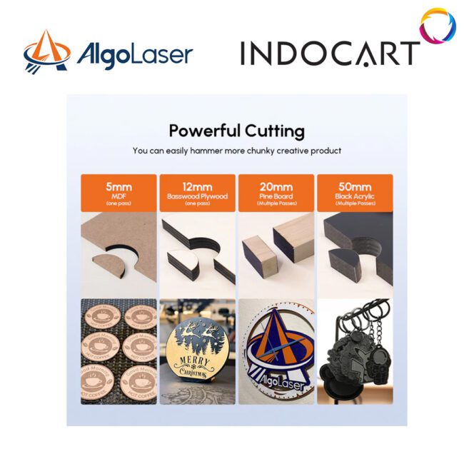 Memotong dan mengukir berbagai material secara efektif, termasuk kayu, akrilik, kulit, kain, karton, dan beberapa logam, menjadikannya ideal untuk berbagai proyek.