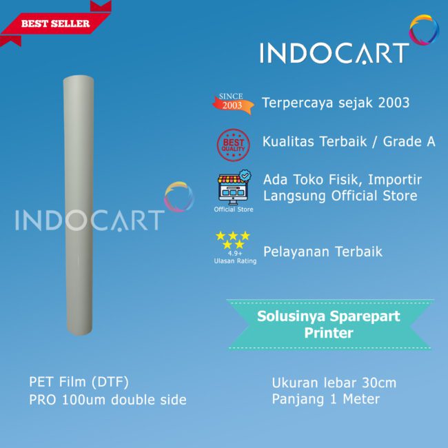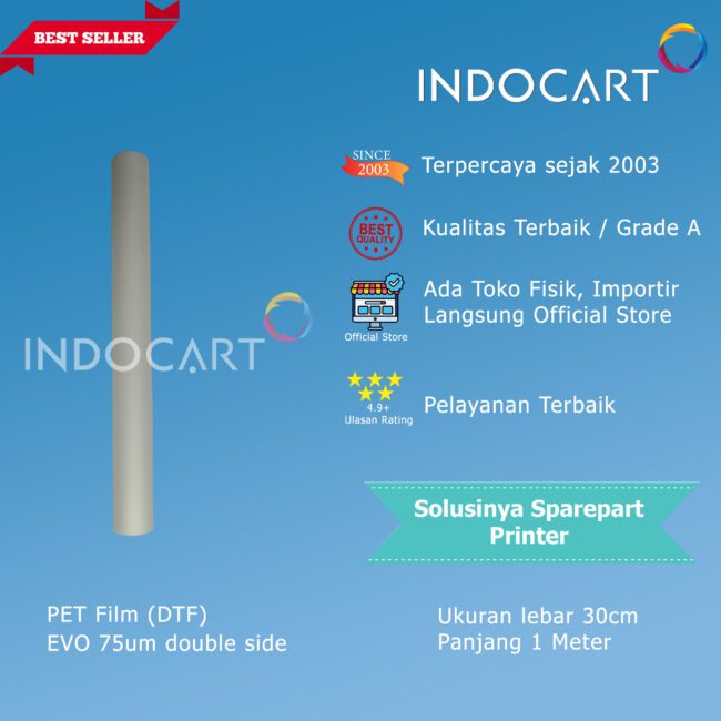 PET film membantu melindungi kualitas cetak dari printer DTF. Film ini memberikan permukaan yang rata dan stabil untuk mencetak gambar atau desain dengan detail yang baik dan warna yang akurat.