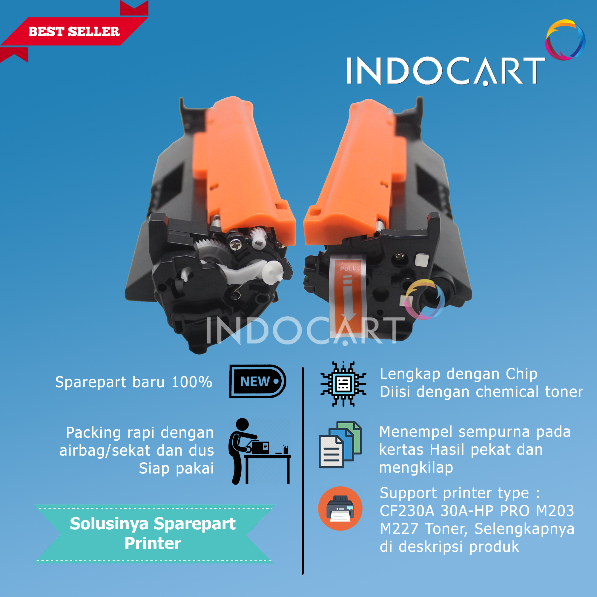 100% sparepart baru. Lengkap dengan segel untuk keamanan toner supaya tidak bocor.
