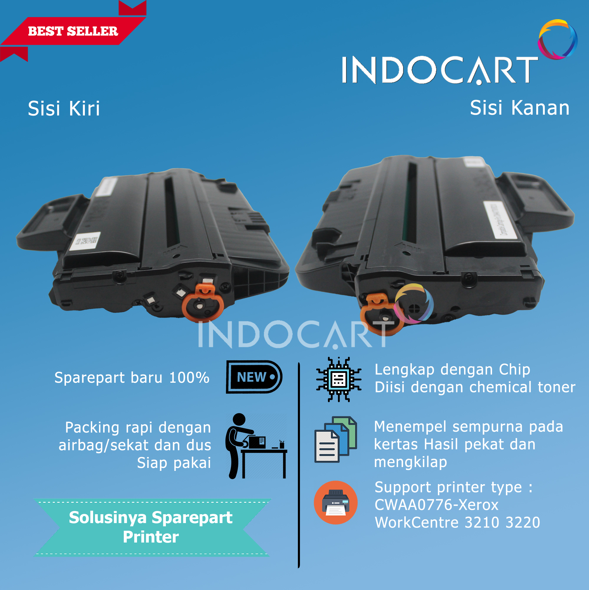 100% sparepart baru. Lengkap dengan segel untuk keamanan toner supaya tidak bocor.